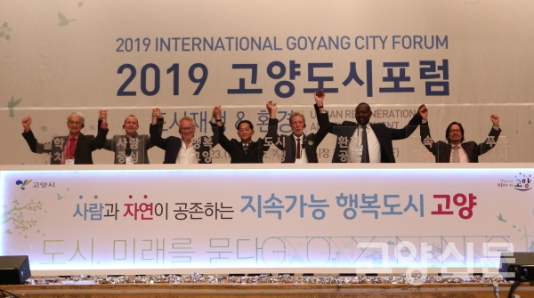 23일 일산 킨텍스에서 진행된 2019 고양도시포럼을 마무리하는 자리에서 이재준 시장은 ▲도시 고유의 철학과 가치에 기반한 발전 ▲사회적 의견 수렴을 통한 도시개발 ▲재생을 통한 도시 정체성의 보전 ▲도심과 자연, 사람을 연결하는 생태네트워크 구축 ▲사람과 나무가 함께 숨 쉬는 푸른도시 조성 ▲자원·공간의 소비를 줄이는 지속가능한 도시를 지향하겠다고 선언했다. 이 시장은 “선언에 담은 내용들이 수십 년 후 고양시의 건물과 거리와 환경으로 뿌리내릴 수 있도록 105만 시민과 함께 아젠다를 적극 실천해 나가겠다”는 의지를 밝혔다.