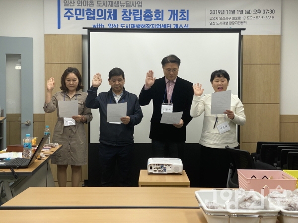 이날 주민총회에서는 일산 도시재생사업을 함께 이끌어 갈 주민공식기구인 ‘일산와야촌 주민협의체’ 추진 경과보고에 이어 운영규정 및 임원 임명 동의를 위한 투표가 진행됐다. 주민협의체 임원진으로는 앞서 8월 4차 발기인단 회의에서 주민투표로 선출된 이경희 대표, 이태우 부대표, 김복심 총무, 이용복 감사 등 4명이 추인됐다. 이어 참가자들은 마을의 발전과 주민 화합을 위해 주민 스스로 고민하며 이웃과 더불어 살아가자는 취지로 주민협의체 창립 선언문을 낭독하며 총회를 마무리했다.