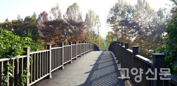 고양체육관 앞 천변에는 대화천 전 구간 중 유일한 보행자전용 다리가 가로질러 놓여있다. 도보다리 위에서 바라보는 대화천의 경관은 여유로우면서도 풍요롭다. 이즈음 찾아가면 강둑을 가득 메운 나무와 콘크리트 법면을 뒤덮은 덩굴식물, 그리고 하천 바닥의 수초들이 가을빛으로 물들어가는 황홀한 풍경을 만날 수 있다.