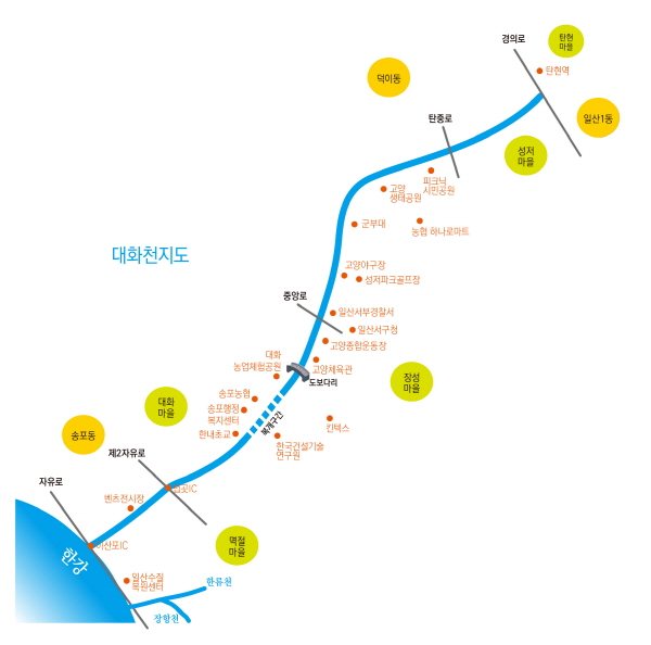 대화천 시점에서 출발해 종점까지 걷고 나니, 그동안 몰랐던 대화천의 매력과 과제가 한꺼번에 머릿속에 들어온다. 매력부터 살펴보자. 첫째, 비록 하천이 아닌 배수로로 태어났지만 30년 세월이 지나며 천변을 따라 나무와 풀이 무성하게 자라 고양의 어느 하천보다도 풍요로운 자연을 품게 됐다는 사실이다. 의도하지 않았던 생태적 선물 하나가 시민들에게 주어진 셈이다. 둘째, 하천 주변에 밀집된 시설들이 무척 다채롭고 공공적이다. 앞서 살펴보았듯 다양한 스포츠시설은 물론, 행정시설(구청·경찰서·행정복지센터), 휴식공간(생태·피크닉·농업체험공원), 대규모 상업·유통시설(농협하나로마트)이 대화천을 따라 파노라마처럼 연속적으로 배치돼 있다.대화천의 두 가지 매력을 들여다보면, 앞으로의 과제가 무엇인지도 자연스레 도출된다. 대화천을 풍요로운 생명이 깃드는 생태하천으로 정비하고, 전 구간을 하나의 동선으로 이어주는 연결로를 구축하면 좋겠다. 또한 동남측과 서북측을 가르는 경계선의 이미지를 벗어버리고, 신도시와 농업지역을 넘나들 수 있는 공간으로 탈바꿈하면 어떨까. 잠재적 가능성이 무궁무진한 대화천의 미래를 구체적으로 상상해보는 즐거운 작업은 다음 주 연재에서 이어가보자.