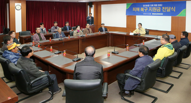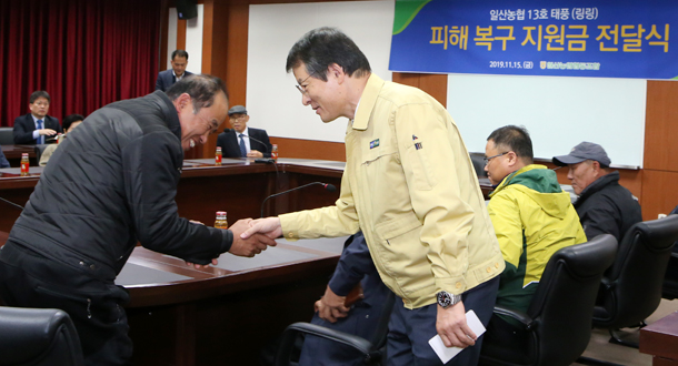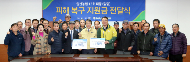 지난 9월 상륙한 제13호 태풍 ‘링링’으로 인해 크고 작은 피해를 입은 346여 농가에 일산농협이 1억 원의 피해복구 지원금을 농민들에게 전달했다. 지난 15일 일산농협 본점 2층 소회의실에서는 김진의 조합장을 비롯해 일산농협 이사와 작목반 연합회, 시설채소추진위원들과 농민들이 참석해 피해복구지원금 전달식을 가졌다. 전달식 이외에도 농민들을 위한 APC(농산물산지유통센터)사업과 미래 방향성, 농자재 지원 등의 대화를 나누는 자리도 됐다.