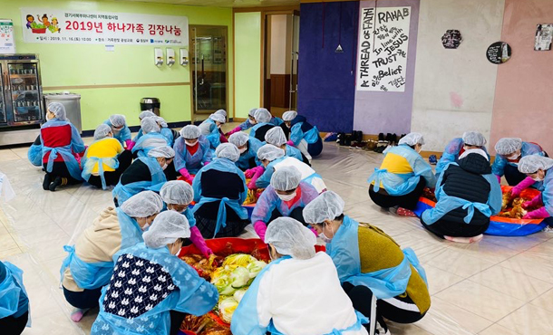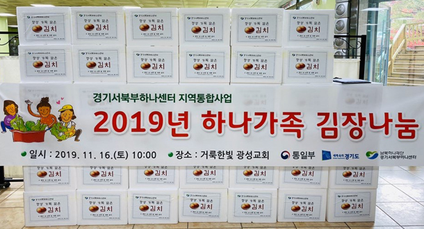 경기서북부하나센터(센터장 안효덕)에서는 지난 16일(토) 탄현동 거룩한빛광성교회에서 남북한 주민 70여 명이 참여한 가운데 ‘2019 지역통합사업 하나가족 김장나눔’ 행사를 가졌다. 이날 행사에서는 300포기의 김장을 담가 2019년 고양, 김포, 파주 지역에 신규 전입한 북한이탈주민 110여 세대에 10kg씩을 전달했다.