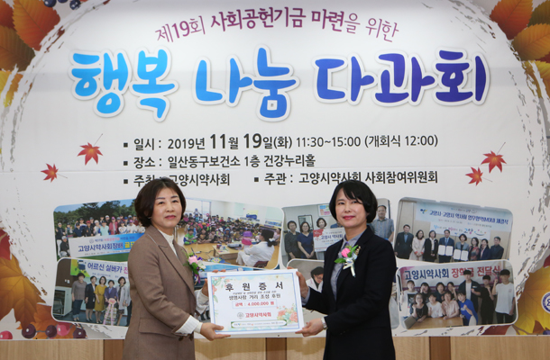 고양시약사회가 사회공헌기금 마련을 위해 행복나눔 다과회를 지난 11월 19일(화) 일산동구보건소 1층 건강누리홀에서 오전 11시 30분부터 개최했다. 고양시약사회 주최와 고양시약사회 사회참여위원회 주관으로 열렸으며, 김은진 고양시약사회장을 비롯해 이윤승 고양시의회 의장과 관계 공무원, 경기도 지역별 약사회장들이 참석해 다과회를 축하했다.