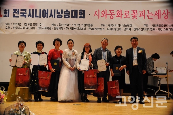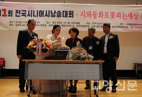 [고양신문] 지난 6일 오전 10시부터 일산 킨텍스 제1관 3층 그랜드볼륨에서 제1회 전국시니어시낭송대회와 '시와 동화로 꽃피는 세상' 창단식이 열렸다. 이 행사는 한국마사회 일산지사, 셋이서문학관, 은평치과, (주)백광아이에스티, (사)한국반달문화원, 타래시동인회, 연화회, 원페스엔타테이먼드, 개간 스토리문학, 금헌 장생연구소, 가우디건축, 금평기계 후원으로 열렸다.