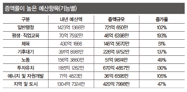 예산별 비율을 살펴보면 많은 변화를 읽을 수 있다. 전반적으로 도로, 개발 등 대규모 SOC사업 비중은 다소 줄어든 반면 환경, 에너지 개발, 투자유치 분야의 예산비중은 높아졌다. 증감률 부분에서 이러한 흐름은 더욱 잘 드러나는데 기후대기(137% 증가), 평생·직업교육(193% 증가), 무역 및 투자유치(1410% 증가), 에너지 및 자원개발(105% 증가)예산이 눈에 띄게 증가했다. 일반행정 예산도 720억원 이상 올랐는데 이 중 500억원가량은 고양시청 신청사 건립기금인 것으로 파악된다.