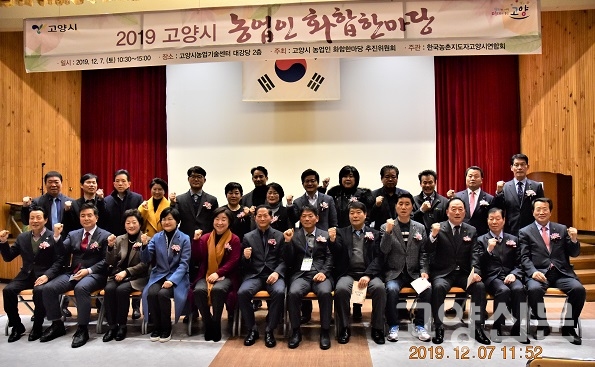 12월 7일, 고양시농업기술센터2층 대강당에서 ‘2019 고양시 농업인 화합 한마당’ 행사가 고양시 농업인 400여 명과 이재준 고양시장, 심상정 정의당 국회의원, 조현숙 환경경제위원과 고양시의회 의원, 고양시 농축산업 협동조합 조합장과 역대 농촌지도자회장이 참여한 가운데 초겨울 날씨에 따뜻한 화합의 장을 마련했다.