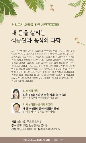 요즘 음식에 대한 관심이 높습니다. 아이부터 어르신까지, 자폐증부터 당뇨와 암까지, 대부분의 질병이 음식에서 비롯된다고들 하지만, 그냥 그런가보다 하고 넘어가곤 했습니다. 그러나 최근 의학계에서 음식과 건강, 음식과 질병이 직접적인 관계가 있음을 입증하는 다양한 실험과 분석이 나오고 있습니다. 또한 그동안 너무 쉽게 쓰거나 맹신했던 항생제와 고혈압, 당뇨, 고지혈증 약이 다른 병을 키우는 부작용이 있음을 경고한 의학논문들이 점점 늘어나고 있습니다. 이제 건강은 약이 아니라, 음식이 좌우한다는 것이 객관적인 사실이 되었습니다. 건강과 생명, 식습관과 음식에 대해 공부하는 자리가 마련됩니다. 새로운 인식의 힘으로 건강한 삶을 준비하는 시간이 될 것입니다. 많은 관심과 참여를 바랍니다.