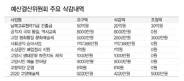 가장 눈에 띄는 삭감내역은 남북교류협력기금 전출금이다. 총 50억원의 기금 전출예산 중 20억원이 삭감됐다. 예결위 이홍규 자유한국당 의원은 “남북관계가 그다지 긍정적이지 못한 상황인데다가 고양시 자체적으로 할 수 있는 역할도 마땅치 않은 만큼 기금적립이 그다지 시급하지 않다고 판단했다”며 “게다가 올해 시청 신청사 기금도 대폭 늘었고 일산테크노밸리, 광역철도사업 등 대규모 사업을 위한 예비비까지 반영된 상황이라 예산의 유동성을 높이기 위해 일부 금액을 삭감한 것”이라고 설명했다. 공직자 국외 통일, 역사교육 예산(전액삭감)과 고양평화통일 문화예술제 예산(2000만원 삭감) 또한 마찬가지로 시급성과 필요성이 떨어진다는 의견이 높아 전액·일부 삭감됐다.