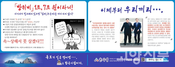 강 대표는 최근 한우물 정수기 제품 홍보 대신 ‘아베왜란, 독도가 일본 땅이면 침략자 아베는 한국 사람이다’, ‘속상해서 못 살겠다. 방위비가 7조원이라니, 미국은 우리의 우방인가 날강도인가’ 등과 같은 인상적인 문구로 일본의 무역보복과 미국의 방위비 협상문제 등을 지적하는 의견광고를 고양신문 등에 게재했다.