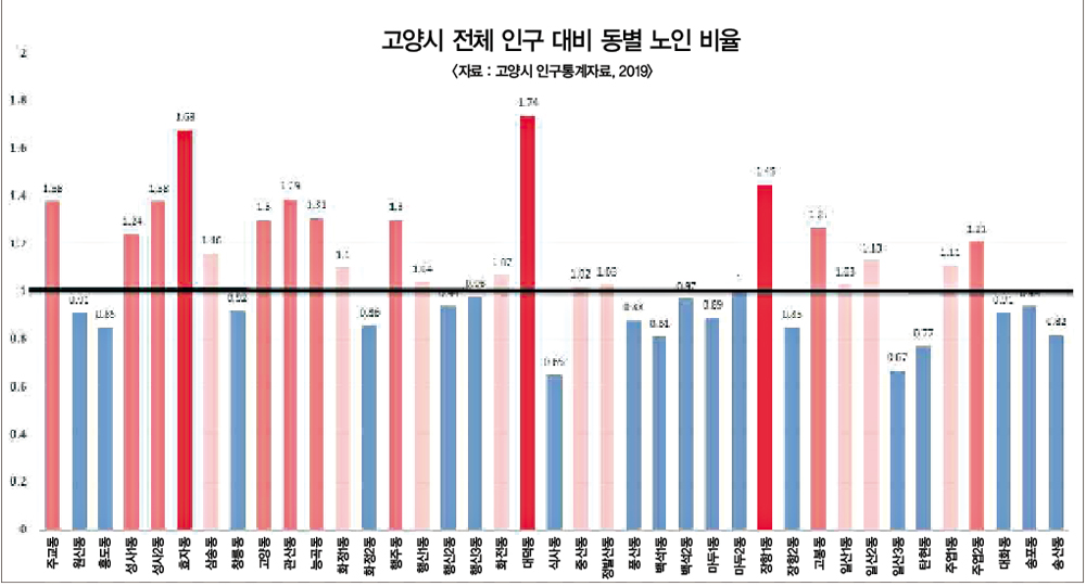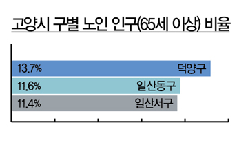 고양시 39개 행정동 중 노인인구 비율이 가장 높은 곳은 덕양구 대덕동과 효자동 등 자연마을이 많은 곳이며 노인인구 비율이 가장 낮은, 다시 말해 ‘젊은이들이 많은 지역’은 일산서구 식사동과 일산동구 탄현동 등이다. 덕양구에선 아파트지역인 화정2동과 흥도동 등이 노인인구가 가장 적었다.