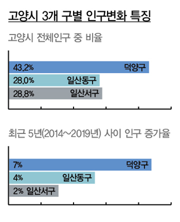 지난 5년간 인구증가율이 가장 컸던 지역은 덕양구 삼송동으로 158%의 증가율을 보였다. 화전동 또한 86%가 증가했다. 반면 덕양구 대덕동은 인구가 절반가량인 47%나 감소한 것으로 나타났다.