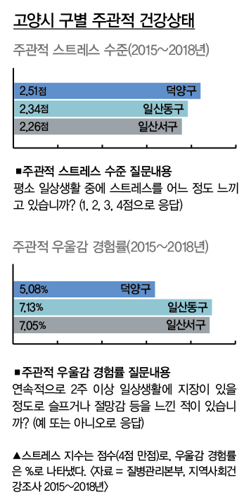 최근 4년간의 우울감 지표를 합산해보면, 일산동구가 7.13%로 우울감이 가장 높은 지역이었고, 그 다음이 일산서구(7.05%), 가장 낮은 곳은 덕양구(5.08%)였다. 최근 4년의 전국 평균 우울감 경험률은 5.5%다. 일산은 전국 평균보다 우울감 수치가 상당히 높은 편에 속한다.