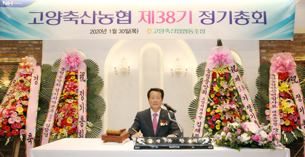 2020년도 고양축산농협(조합장 유완식) 제38기 정기총회가 지난달 30일 오전 10시30분부터 일산동구 뷔페파크에서 열렸다. 김재득 농협중앙회 고양시지부장과 지역 시·도의원, 수원·양주·부천축산농협 조합장과 관계자, 원로조합원, 고양축협 임직원과 대의원 등이 참석해 총회를 축하했다.