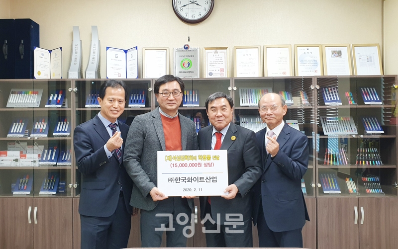 [고양신문] 일산서구 구산동에 있는 한국화이트산업(대표 장재희)이 재단법인 석성장학회(회장 조용근)에 1500만원 상당의 학용품을 기부하고 11일 전달식을 가졌다.