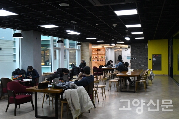 지하1층으로 내려가면 공공도서관답지 않은 힙한 공간이 펼쳐진다. 지난달 공사를 마친 대화도서관 창업인프라 공간 ‘디노스페이스’의 모습이다. 디노스페이스(DINO SPACE)는 Daehwa(대화도서관)과 Innovation(혁신) 합성어인 큰 변화와 혁신을 일으킬 공간이라는 의미로 작년 경기도 특별조정교부금 5억원을 확보해 마련했다. 어두컴컴했던 공간에 열린책공간, 모둠방, 도시락방, 창업연구공간, 야외쉼터 등이 새롭게 마련되면서 활기찬 분위기로 변화하기 시작했다.