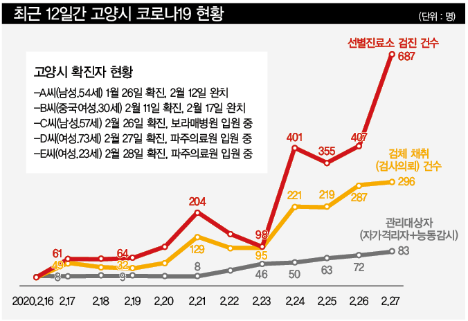 코로나19에 대한 지역 분위기를 확인하기에 가장 좋은 지표는 ‘선별진료소 검진 건수’다. 최근 자료를 확인해보면, 2월 16일 고양시 선별진료소를 찾았던 사람은 4명에 불과했지만, 27일 검진자는 687명으로 대폭 증가했다. 선별진료소 방문자 수는 일산보다는 덕양구에 집중되는 양상이다. 코로나 진단검사를 위한 검체 채취도 하루 50명을 밑돌았지만, 최근에 매일 200명이 넘는 시민들에 대해 검사를 실시하고 있다. 가장 최근인 28일(오전 10시) 기준 모니터링 관리대상자는 총 83명(자가격리 79명, 능동감시 4명)으로 확인됐다. 고양시의 자가격리자와 선별진료소 검진자, 검사의뢰를 위한 검체 채취자 수는 20일을 전후로 모두 급격히 증가하는 추세를 보이고 있다.