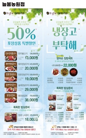 4월 5일까지 진행되는 응원프로젝트는 한우양념불고기(2~3인분/3만6000원)를 1만3000원에, 돼지양념구이(3~4인분/4만5000원)는 2만원, 한돈양념구이(2~3인분/3만8000원)는 1만9000원, 술래양념구이(2~3인분/5만8000원)는 2만9000원, 왕양념갈비(2~3인분/7만6000원)는 3만8000원으로 포장상품을 50% 특별 할인한다.