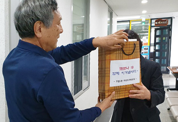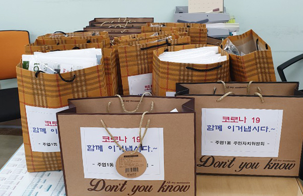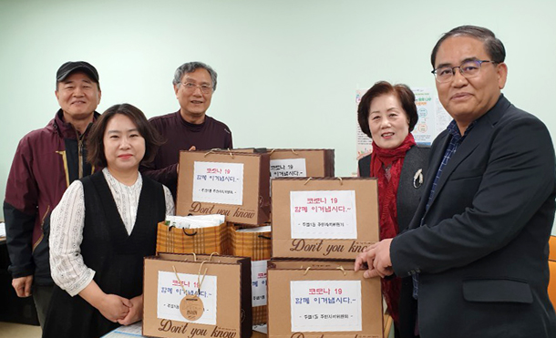 "코로나19 함께 이겨 냅시다“ 지난 26일 주엽1동 주민자치위원회(위원장 송광수)가 800장의 면마스크를 마련해 지역 내 18개 단지 경로당 어르신들과 취약계층을 위해 전달했다. 코로나19 예방을 위해 전달된 마스크는 구입이 어려운 취약계층과 어르신들을 대상으로 지난 19일 주민자치위원들이 직접 전달했다. 이날 마스크를 전달하기 위해 최병선 동장을 비롯해 주민자치위원 동직원등이 함께 참여해 도움을 주기도 했다.