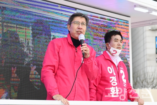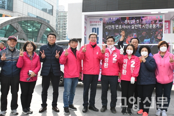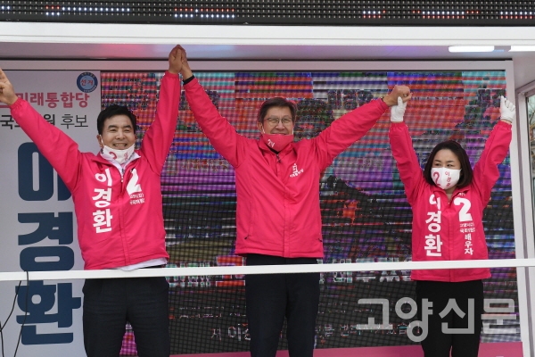 이경환 미래통합당 고양시갑 후보에 대한 지지도 함께 호소했다. 박 위원장은 “이경환 후보는 능력있는 법률전문가이자 ‘우리동네 변호사’라는 별명처럼 고양을 사랑하는 정치인”이라며 “말로만 고양을 바꾸겠다며 실상 중앙정치에만 매몰되는 정치인보다는 이 후보가 훨씬 더 주민의 삶을 바꿀 수 있다”며 심상정 정의당 후보를 겨냥하기도 했다. 이어 “나라경제도 바로잡고 문재인정권의 실정에 회초리를 들기 위해 이 후보가 국회에 입성해야 한다”며 “고양시갑 선거에서 핑크혁명을 반드시 일으켜달라”고 강조했다. 유세연설을 마친 박 위원장은 이경환 후보와 함께 화정역 일대 주민들을 만나며 이 후보와 미래통합당에 대한 지지를 당부했다.