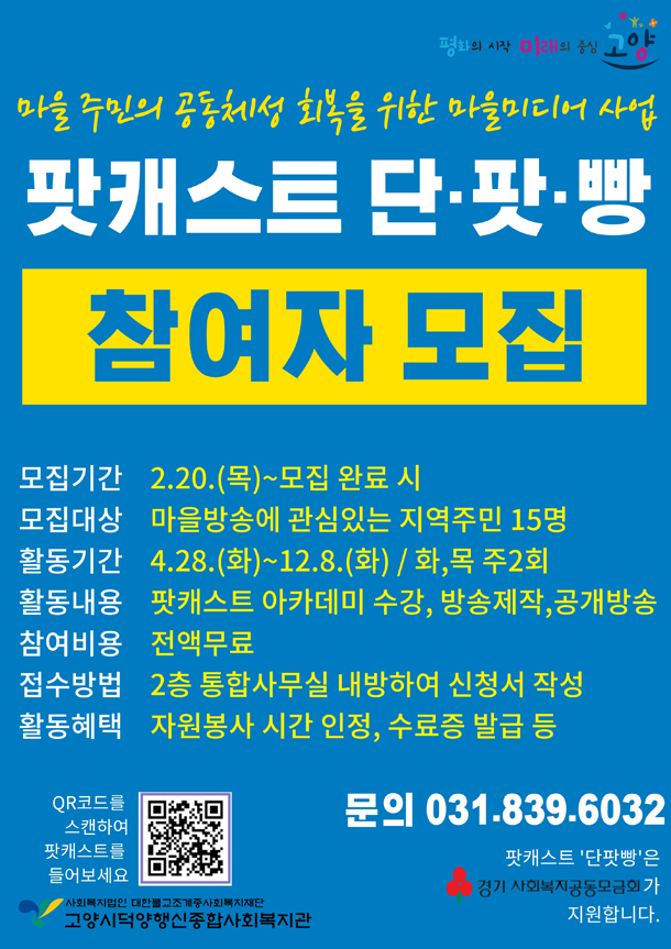 ‘단.팟.빵’은 사회복지공동모금회에서 지원받아 운영되는 사업으로, 팟캐스트 아카데미(교육), 팟캐스트 제작 활동, 고양미디어센터와 함께하는 공개방송 등 이웃과 함께하는 다양한 활동이 진행될 예정이다.