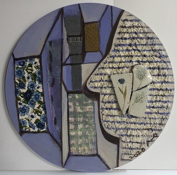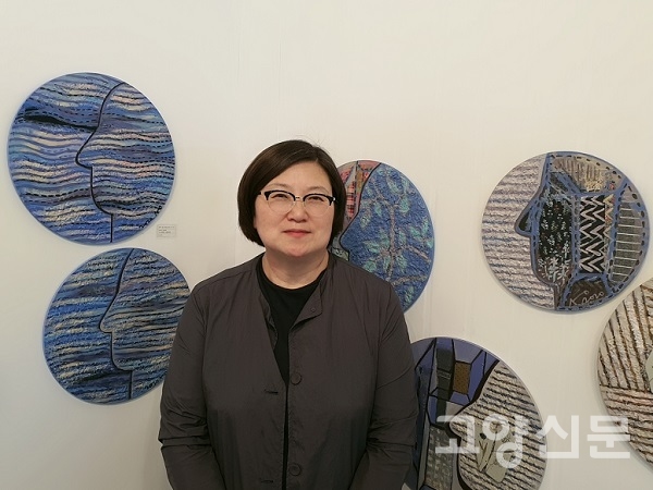 또 다른 전시품인 ‘응시’ 시리즈는 80년대부터 꾸준히 해왔던 작업이다. 둥근 형태에 표현한 사람 형상의 작품들에는 ‘내가 나 자신을 바깥에서 본다’는 철학적인 의미를 담았다. 화면의 질감을 다르게 하기 위해 종이를 갈아서 수성 본드에 섞어 우툴두툴하게 표현했다. 거기에 타일 조각과 천 조각을 붙이기도 했다. 질감, 색깔, 구성처럼 순수한 조형요소에 집중해 작업한 결과물이다.