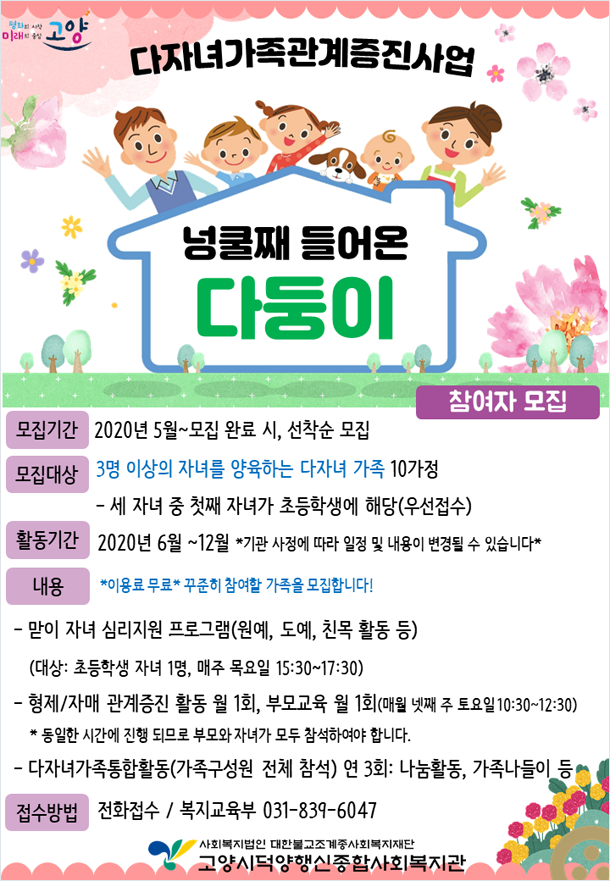 고양시덕양행신종합사회복지관(관장 성화스님)에서는 다자녀가정 대상 심리·사회적 서비스를 통한 스트레스 완화 및 긍정적 가족 관계 형성을 위해 2020년도 신규 사업으로 「다자녀가족관계증진사업」을 기획했다. 다자녀가족관계증진사업은 맏이 자녀의 심리지원을 위한 '아동심리지원프로그램', 양육스트레스 감소를 위한 '부모교육', 형제·자매의 관계증진을 위한 '협동/놀이 활동', '가족 통합 활동, 가족나들이, 가족봉사활동' 등으로 계획되어 있다.