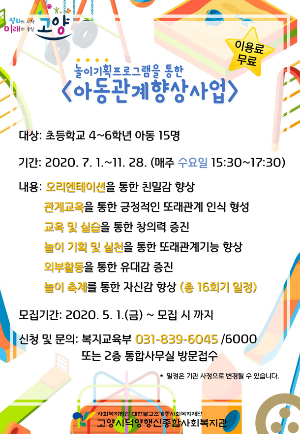 고양시덕양행신종합사회복지관(관장 성화스님)에서는 초등 고학년(4~6학년) 아동의 놀이 기획 활동을 통한 긍정적인 또래 관계 형성을 위해 2020년도 ‘아동관계향상사업’을 기획했다. 아동관계향상사업은 긍정적인 또래관계 인식 형성을 위한 ‘관계교육’, 아동들의 창의력과 또래관계 기능 향상을 위한 ‘놀이 교육 및 기획과 실천활동’, 유대감과 자신감 증진을 위한 외부활동과 놀이축제로 계획되어 있다.