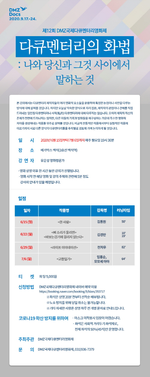 [고양신문] DMZ국제다큐멘터리영화제가 다큐멘터리 영화와 평론가의 연계강의가 이어지는 기획상영회 ‘다큐멘터리의 화법:나와 당신과 그것 사이에서 말하는 것’ (이하 ‘다큐멘터리의 화법’)을 메가박스 백석에서 진행한다. 6월 15일부터 한 달간 매주 월요일 저녁 7시 30분, 유운성 영화평론가의 강의와 함께 진행될 ‘다큐멘터리 화법’은 다큐멘터리 영화가 어렵게 느껴졌던 관객들에게 다큐멘터리 감상의 이해와 흥미를 높이고자 기획되었다.