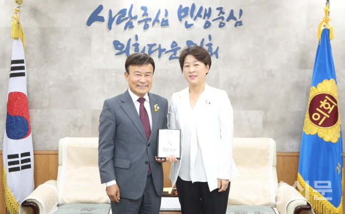 김원웅 광복회장은 15일 경기도의회를 방문해 친일잔재 청산을 위한 다양한 활동에 감사를 표하며 ‘역사정의실천정치인’ 선정기념패와 임시정부시대의 태극기를 전달했다. 선정기념패에는 정의, 견고함을 상징하는 노각나무가 새겨졌다.