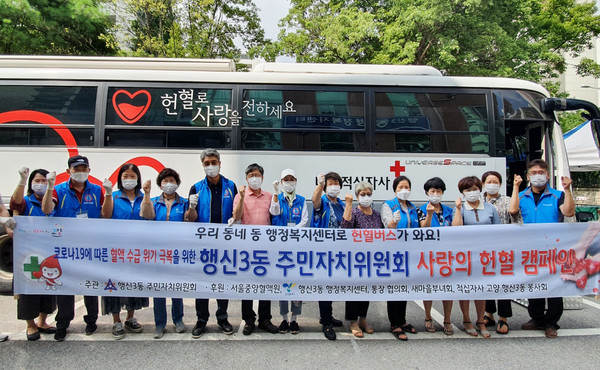 행신3동 주민자치위원회가 전년대비 헌혈 참여 인구가 급감해 혈액 수급 위기 극복을 위한 ‘사랑의 헌혈 캠페인 사업’을 개최했다. 이번 캠페인은 서울 중앙 혈액원에서 헌혈버스 출장을 지원하고 주민자치위원, 통장 등이 참여한 가운데 동 행정복지센터 주차장에서 진행됐다. 주민들은 헌혈버스에 오르기 전 마스크 착용과 손 소독 등을 꼼꼼히 체크하고 실시하며 코로나19 감염 예방 수칙을 철저히 준수했다.