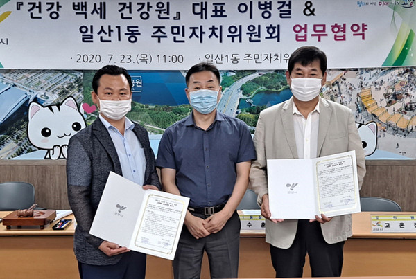 일산1동 주민자치위원회(위원장 배영민)가 지난 23일 일산1동 주민자치센터에서 주민 복지증진을 위해 건강백세 건강원과 지속적인 나눔 활동을 약속하는 업무 협약식을 가졌다. 이날 협약식은 지역의 어려운 이웃에 조금이나마 도움이 되고자 하는 백세건강원 대표와 인연이 돼 일산1동 취약계층 노약자의 건강증진에 도움이 되는 업무협약으로까지 이어지게 됐다.