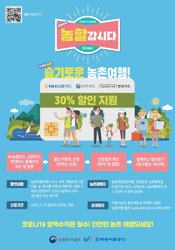 ‘농촌관광 어디까지 가봤니?’는 코로나19로 인해 경영에 어려움을 겪고 있는 농가를 지원하고 농촌관광 활성화를 위해 마련된 행사로 8월말까지 농촌체험 시 1인당 이용액의 30%, 최대 3만원까지 할인 혜택을 받을 수 있는 농촌관광 할인 지원사업이다.