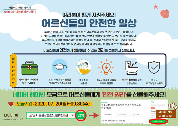 고양시문촌7종합사회복지관(관장 윤 영)이 지난 7월 20일 코로나19로 어려움을 겪고 있는 지역사회 내 취약한 어르신 세대의 안전을 위한 ‘후원나눔 캠페인 시즌Ⅱ’ 모금함을 개설했다.