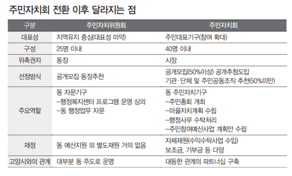 이 같은 시의 입장과 달리 주민자치회 제도가 성공을 거두기 위해서는 행정의 역할이 높아져야 한다는 지적도 나온다. 고양시 한 마을활동가는 “주민자치회의 권한은 높아진 반면 여전히 대다수 주민들은 변화된 제도에 대해 알지 못하는 것이 현실”이라며 “단순히 홍보부족문제가 아니라 행정이 조례개정단계에서부터 더 많은 주민들에게 알리고 목소리를 듣는 과정이 있어야 했는데 그러지 못해 아쉽다”고 전했다. 해당 활동가는 “남은 32개 동에 대해서는 이러한 문제를 보완할 수 있도록 사전에 공론화 과정도 확대하고 필요하다면 추가적인 조례재개정에도 나서야 한다”는 의견을 나타냈다.