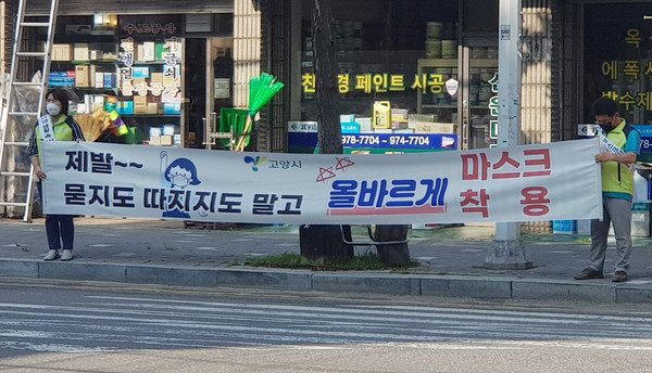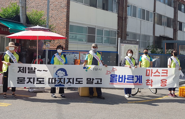 전국적인 사회적 거리두기 2단계 격상과 경기도 마스크 쓰기 의무화에 따라 행주동(동장 김종천)이 지난 14일 부터 능곡전통시장과 지도로 교차로 등에서 ‘올바른 마스크 쓰기 캠페인’을 진행하고 있다.
