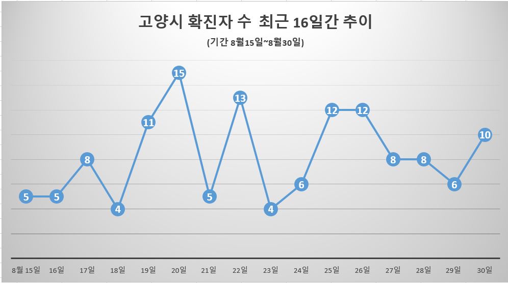 시는 30일 일산동구 성석동에 위치한 A요양원에서 8명의 확진자가 발생했다고 밝혔다. 이날 양성판정을 받은 노인 8명(254~261번)은 모두 입소자들로 60대 후반에서 90대까지 치명률 높은 고연령층이다. 시는 양성판정이 확인된 30일부터 9월 13일까지 해당 요양원 전체를 대상으로 ‘코호트 격리’(환자와 의료진 모두 폐쇄 격리)조치를 내린 상태다.