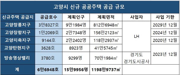 고양시 신규주택 공급물량 6만7000호는 ▲창릉3기신도시 3만8327호(계획인구 9만1984명) ▲장항지구 1만2069호(계획인구 2만7348명) ▲방송영상밸리 3780호(계획인구 9299명) ▲지축지구 9144호(계획인구 2만2402명) ▲탄현지구 3628호(계획인구 8923명)을 포함한다.