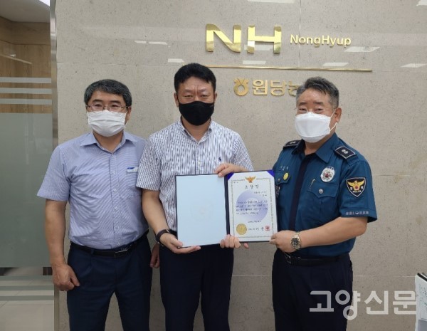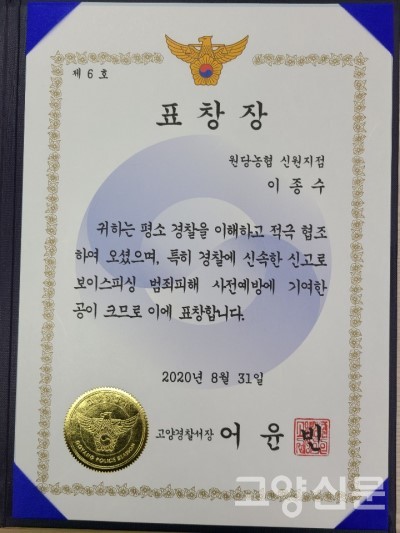 [고양신문] 원당농협(조합장 강효희) 신원지점(지점장 정광훈)에 근무하는 이종수 과장대리가 전화금융사기(보이스피싱) 피해를 막아 지난 31일 어윤빈 고양경찰서장으로부터 표창장을 받았다.