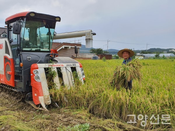 [고양신문] 올해 유난히도 길었던 장마와 장마 끝에 몰려온 태풍 3개를 모두 이겨낸 고양쌀이 일산동구 문봉동에서 9일 첫 수확됐다. 황금빛깔로 물들어가는 문봉들녁에서 만난 김민형(56세) 은곡농원 대표는 조생종인 ‘해담쌀’ 품종을 한아름 안고 환하게 웃었다.