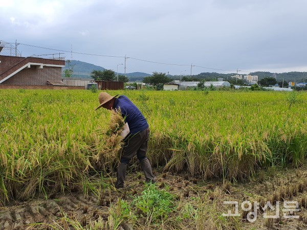 다행이 태풍은 큰 피해 없이 고양시를 빗겨 갔지만 올해는 비가 많이 와 농민들의 걱정이 컸다. 이곳 김 대표의 문봉동 농지도 부지런히 미리 배수로 정비를 했는데도 불구하고 많은 빗물이 논으로 몰리면서 논둑 양쪽이 터지는 사고가 발생하기도 했다. 그러나 농부의 꼼꼼한 보살핌으로 쓰러짐 없이 튼실하게 잘 자라준 해담쌀은 예상보다 풍성한 결실을 맺어 이날 수확하게 됐다.