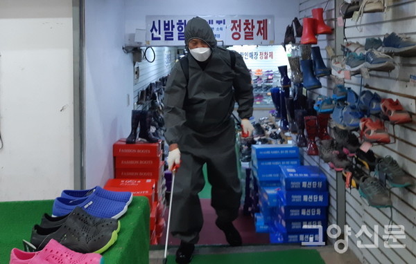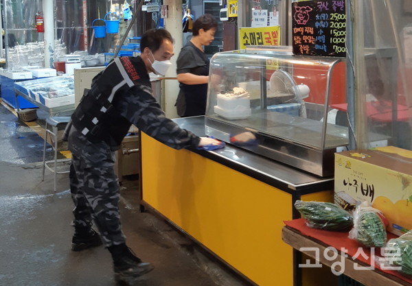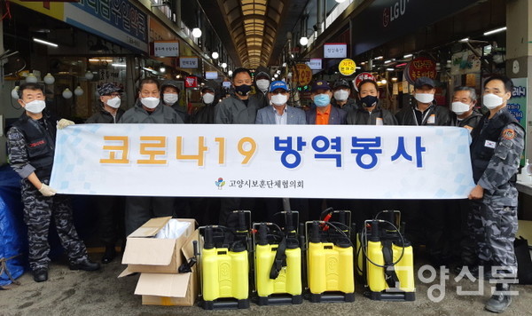 [고양신문] 고양시보훈단체협의회(회장 이묘상)가 3일 덕양구 주교동 원당시장에서 코로나19 방역 봉사활동을 펼쳤다. 협의회 소속 8개 보훈단체 회원 30여 명은 이날 오전 10시부터 시장 구석구석을 돌며 분무기로 소독제를 살포하고, 스프레이와 면수건을 이용해 점포 판매대를 일일이 닦아내는 작업을 진행했다.