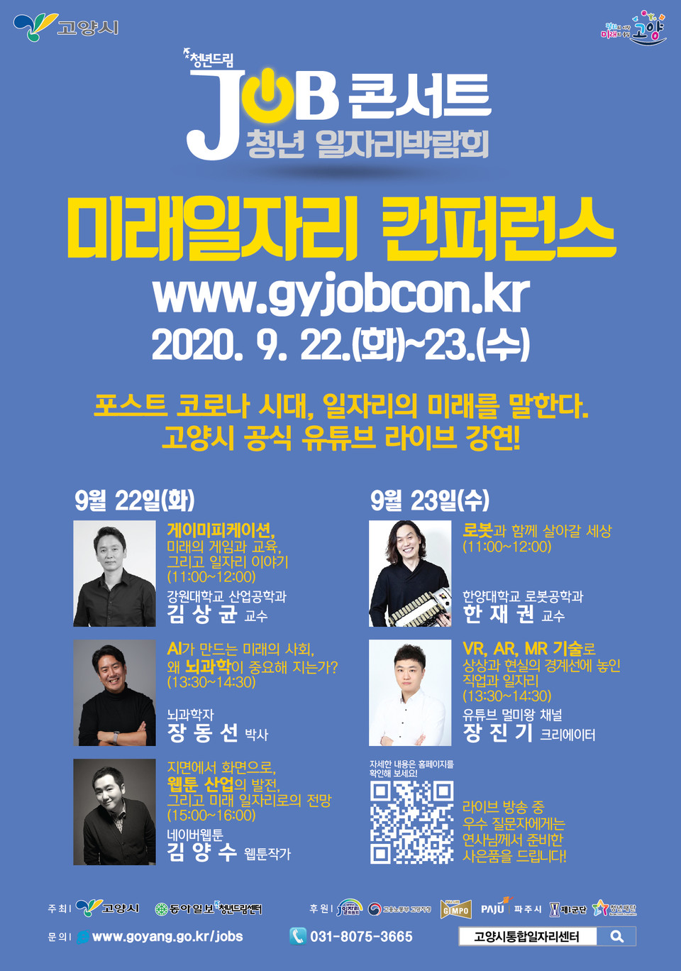 포스트 코로나 시대를 대비해 일자리 방향을 제시할 미래일자리 컨퍼런스는 고양시 유튜브 채널로 중계한다. 미래일자리 전망, 트렌드, 컨텐츠, 4차산업 등에 관련된 주제로 ▲게이미피케이션, 미래의 게임과 교육, 그리고 일자리 이야기(김상균 교수) ▲AI가 만드는 미래의 사회, 왜 뇌과학이 중요해지는가?(뇌과학자 장동선 박사) ▲지면에서 화면으로, 웹툰 산업의 발전, 그리고 미래 일자리로의 전망(네이버웹툰 김양수 작가) ▲로봇과 함께 살아갈 세상(로봇공학자 한재권 교수) ▲VR, AR, MR 등의 기술로 상상과 현실의 경계선에 놓인 직업과 일자리(멀미왕 채널 장진기 크리에이터) 등의 강연이 예정되어 있으며, 일자리에 관심 있는 사람이면 누구나 박람회 사이트를 통해 강연을 들을 수 있다.
