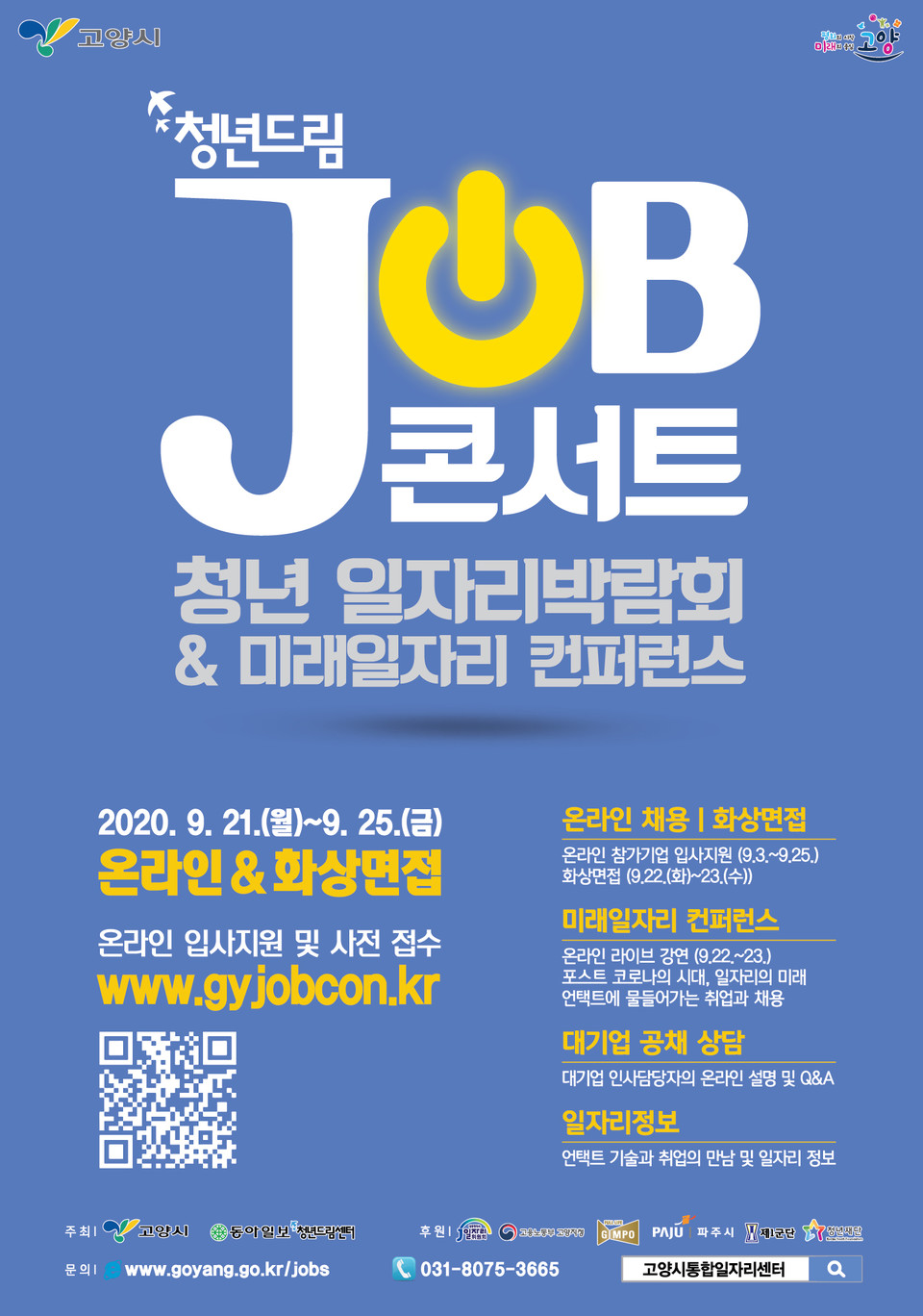 [고양신문] 청년일자리박람회인 ‘청년드림 JOB콘서트’가 오는 9월 21일(월)부터 25일(금)까지 온라인(www.gyjobcon.kr)으로 진행된다. 비대면 온라인으로 진행되는 이번 일자리박람회에서는 유튜브를 통해 미래일자리 컨퍼런스도 함께 열린다.