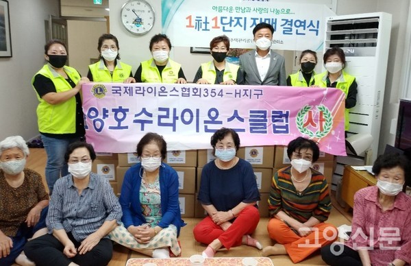 [고양신문] 고양호수라이온스클럽(회장 곽인숙)이 지난 10일 대한노인회 덕양구지회(지회장 우일덕) 샘터2경로당(회장 유영채)에 사랑나눔 꾸러미를 전달했다.