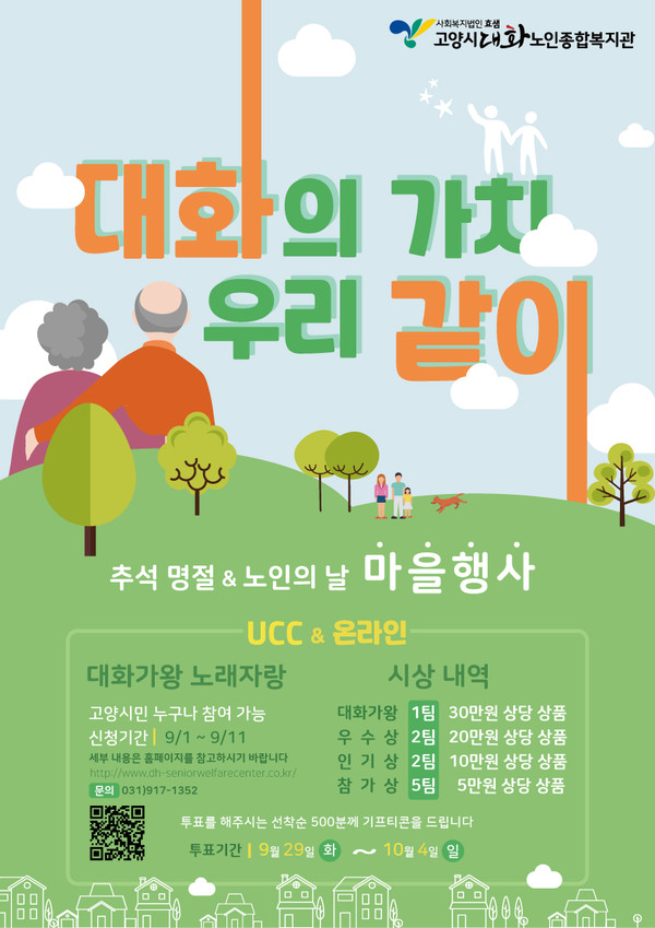 고양시대화노인종합복지관은 추석명절과 노인의 날을 맞이해 이용자와지역주민 누구나 참여가 가능한 ‘대화의 가치, 우리 같이’ <대화가왕> 비대면 온라인 노래자랑을 진행했다. 지역사회 중심의 노인복지관으로 전환해 지역주민이 함께 참여하는 행사를 계획했으며, 코로나19로 인해 대면 행사가 아닌 비대면 온라인 행사로 했다.