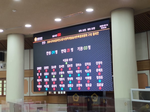 [고양신문] 코로나19가 낯선 환경변화를 가져옴에 따라 시의회 차원에서 대응정책 발굴, 조례 제·개정, 지역경제 피해지원 대책 등을 위한 특별위원회를 구성을 담은 의안이 고양시의회에서 상정됐지만 부결됐다. 박현경 의원이 대표발의하고 장상화 의원 등 7명의 의원이 찬성한 ‘코로나19로 달라진 고양시 정책개발을 위한 특별위원회 구성 결의안’이 14일 표결 결과, 재적의원 33명 중 찬성 9명, 반대 21명, 기권 3명으로 부결된 것.