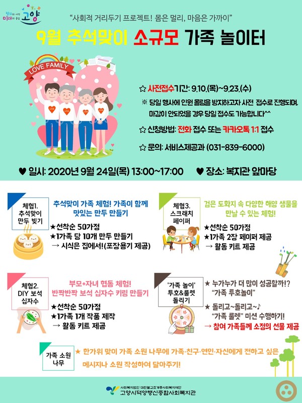 추석맞이 소규모 가족 놀이터’ 관련한 문의는 덕양행신종합사회복지관 서비스제공과 031-839-6000로 하면 된다. 이번 행사는 코로나19 2단계 지침으로 실외행사 100명 이내 규모로 진행이 된다.
