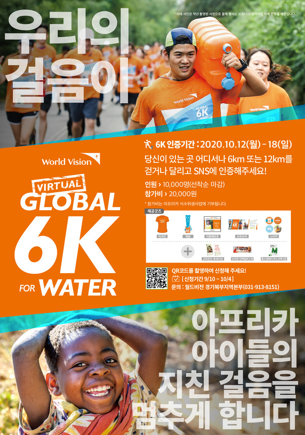세계 최대 국제개발구호NGO 월드비전은 2014년부터 개발도상국 아이들이 겪는 식수 문제에 대한 관심을 촉구하기 위해 글로벌 6K를 진행하고 있다. 올 한해 미국, 캐나다, 프랑스 등 총 30개 국에서 7만여 명이 온라인 버추얼 런 방식으로 글로벌 6K에 동참하고 있다.