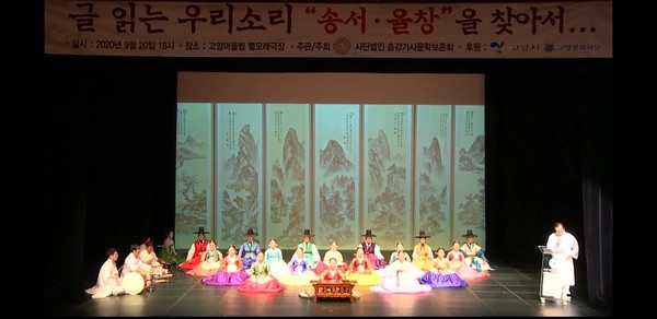 ㈔송강가사문학보존회(이사장 고영란)가 20일 고양어울림누리 별모래극장에서 ‘우리의 글 읽는 소리 송서율창 국악 한마당’을 개최했다. 무관객 비대면으로 유튜브를 통해 진행된 이날 행사는 송서율창을 비롯해 장구병창, 양산학춤, 남도민요, 경기민요, 북병창 등 다양한 국악공연으로 진행됐다.