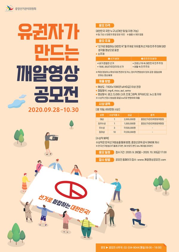 중앙선거관리위원회는 유권자가 영상으로 선거와 민주주의에 대한 생각을 자유롭게 표현하는 장을 마련하기 위해 ‘깨알영상 공모전’을 개최한다. ‘선거로 화합하는 대한민국’을 주제로 ‘선거(내가 경험한 선거, 18세 새내기 유권자의 선거)’, ‘민주주의(코로나19 속 대한민국 민주주의, 생활 속 민주주의)’ 분야에 누구나 응모할 수 있다.